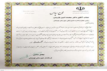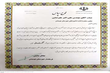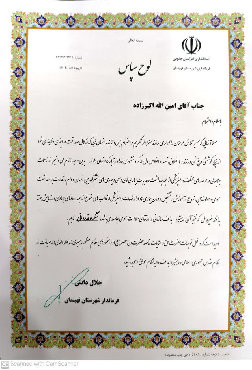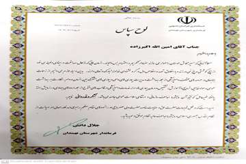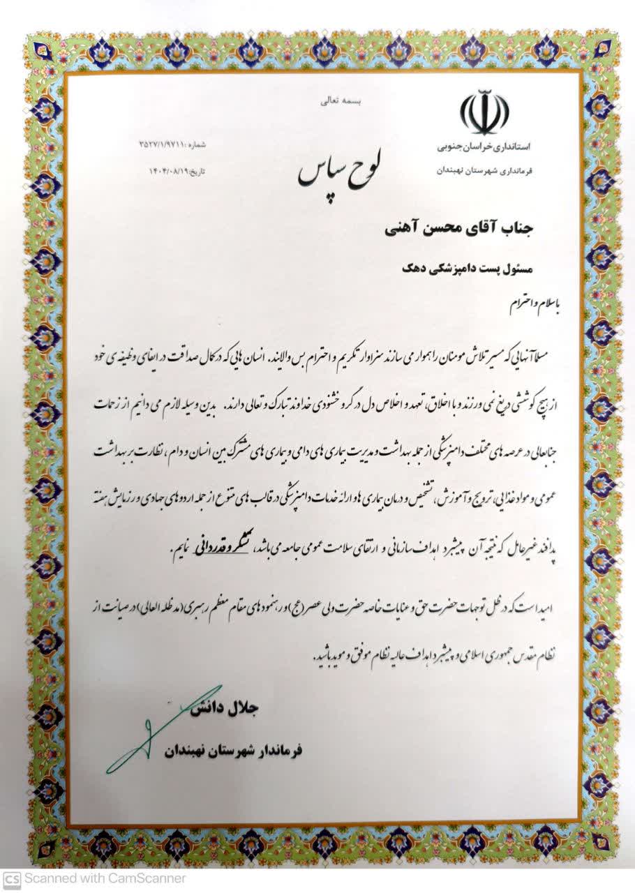 بدین وسیله لازم می دانیم از زحمات جنابعالی در عرصه های محتلف دامپزشکی از جمله بهداشت و مدیریت بیماری های دامی و بیماری های مشترک بین انسان و دام، نظارت بر بهداشت عمومی و مواد غذایی، ترویج و آموزش، تشخیص و درمان بیماری ها و ارائه خدمات دامپزشکی در قالب های متنوع از جمله اردوهای جهادی و رزمایش هفته پدافند غیرعامل که نتیجه آن پیشبرد اهداف سازمانی و ارتقای سلامت عمومی جامعه می باشد، تشکر و قدردانی نمایم.