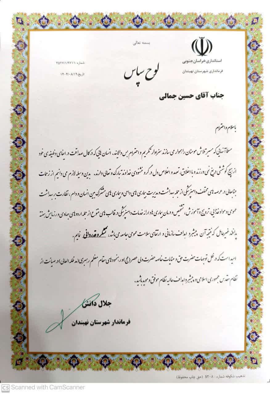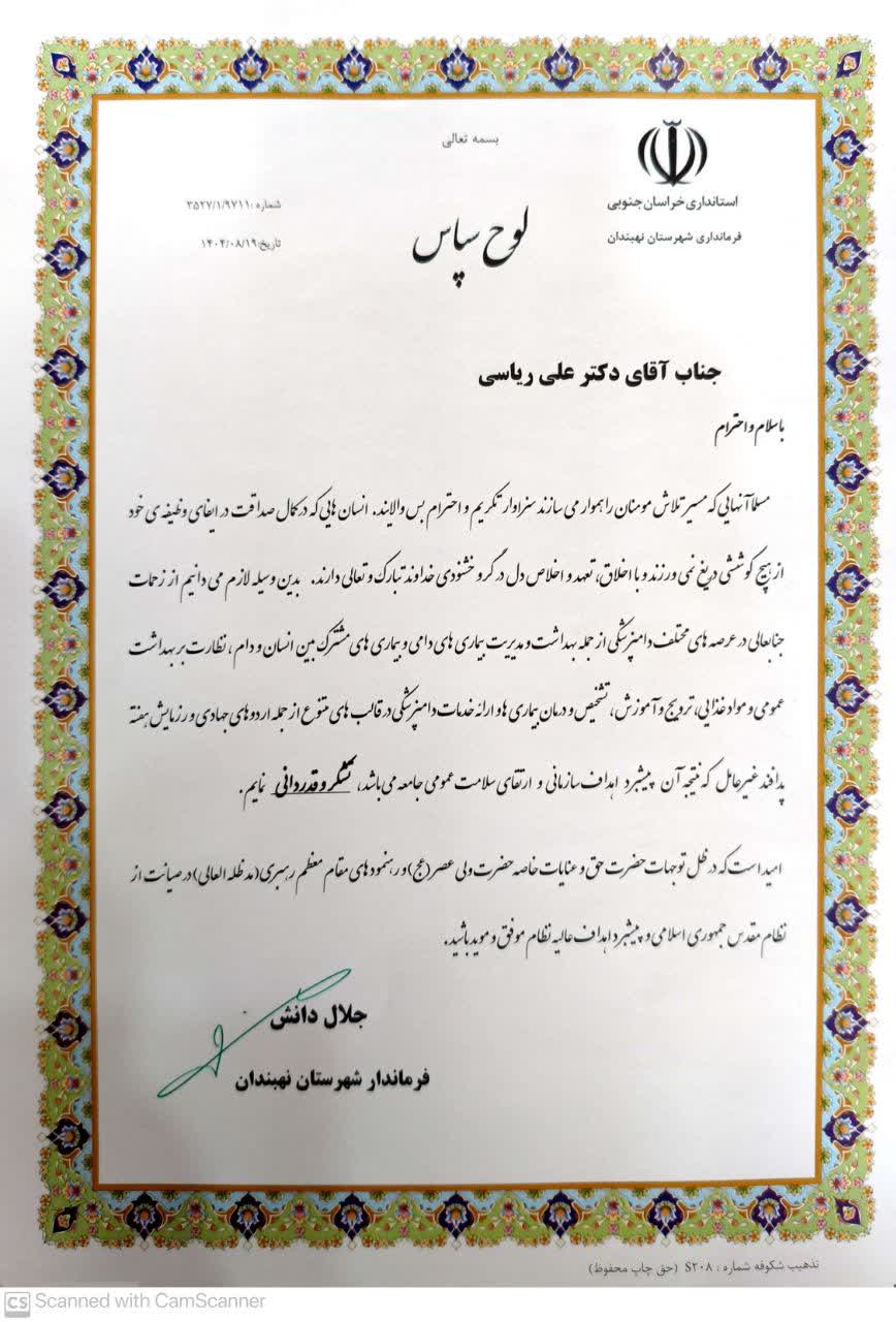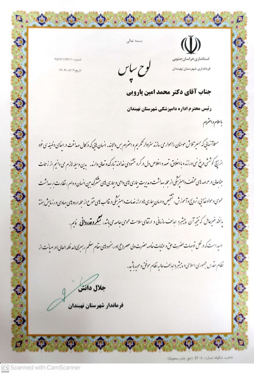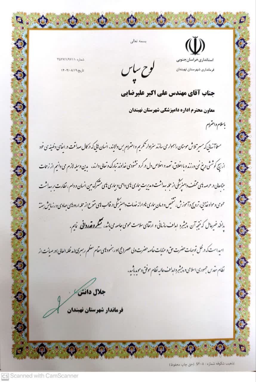 فرماندار نهبندان از زحمات همکاران دامپزشکی نهبندان در ارتقای سلامت عمومی جامعه تقدیر نمود.