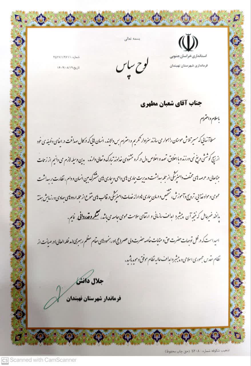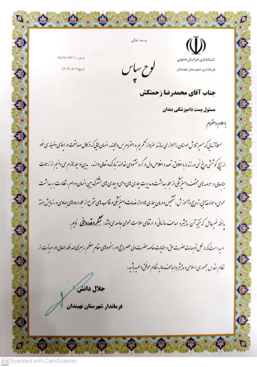 رئیس محترم شبکه دامپزشکی شهرستان نهبندان