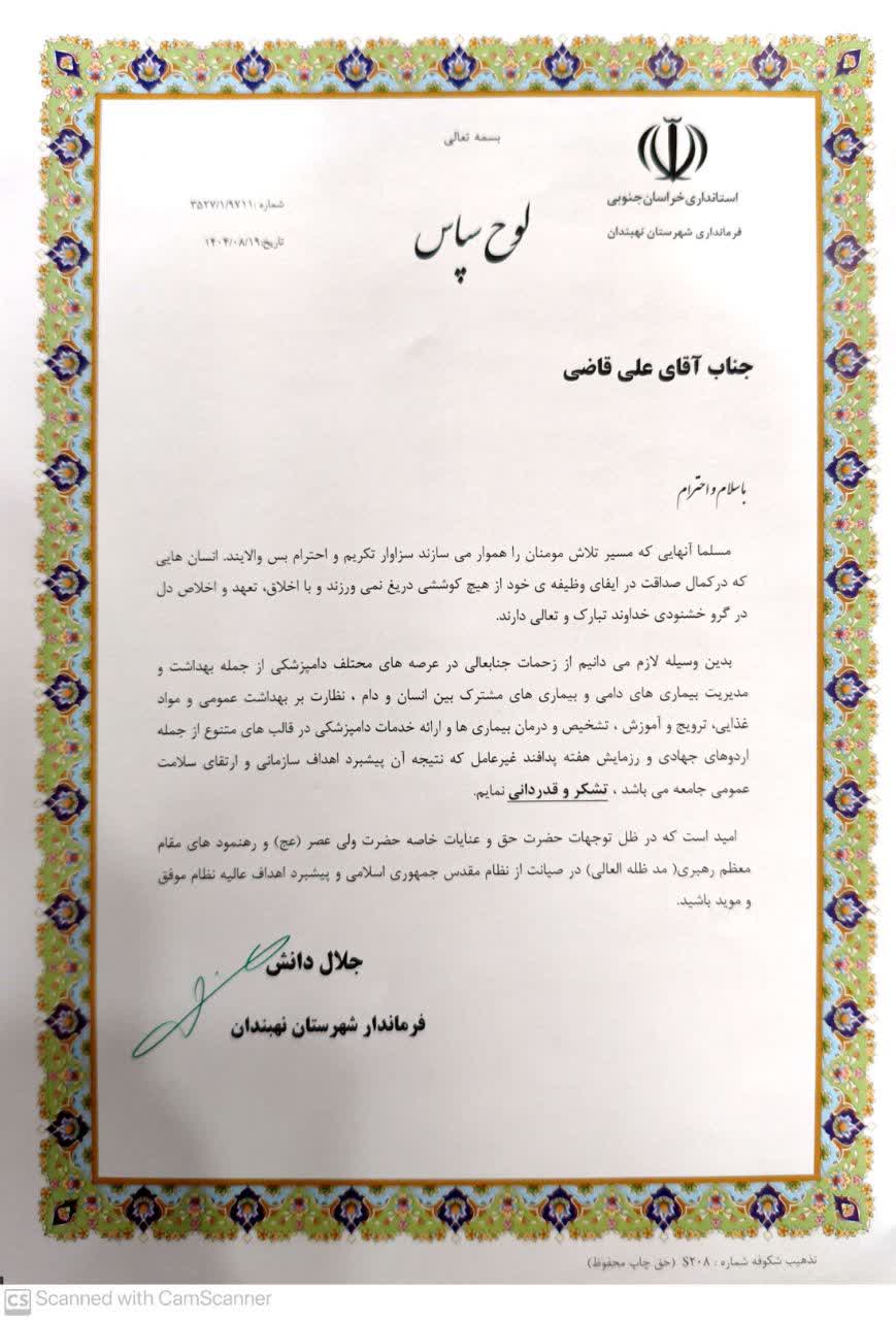 تقدیر فرماندار از کارکنان شبکه دامپزشکی شهرستان نهبندان