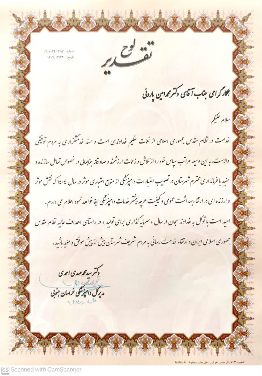 به این وسیله مراتب سپاس خود را از تلاش و زحمات ارزشمند و صادقانه جنابعالی در خصوص تعامل سازنده و مفید با فرمانداری شهرستان در تصویب اعتبارات دامپزشکی از منابع اعتباری موثر در سال 1404 که نقش موثر و ارزنده ای در ارتقا بهداشت عمومی و کیفیت هر چه بیشتر خدمات دامپزشکی ایفا خواهد نمود اعلام می دارم.