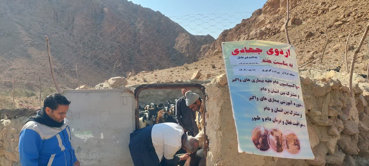 واکسیناسیون و ایمن سازی دام ها، توزیع سم و نهاده و سم پاشی جایگاه دام و آموزش دامداران منطقه محروم خراوان و محمدیه شهرستان طبس به مناسبت هفته پدافند غیر عامل