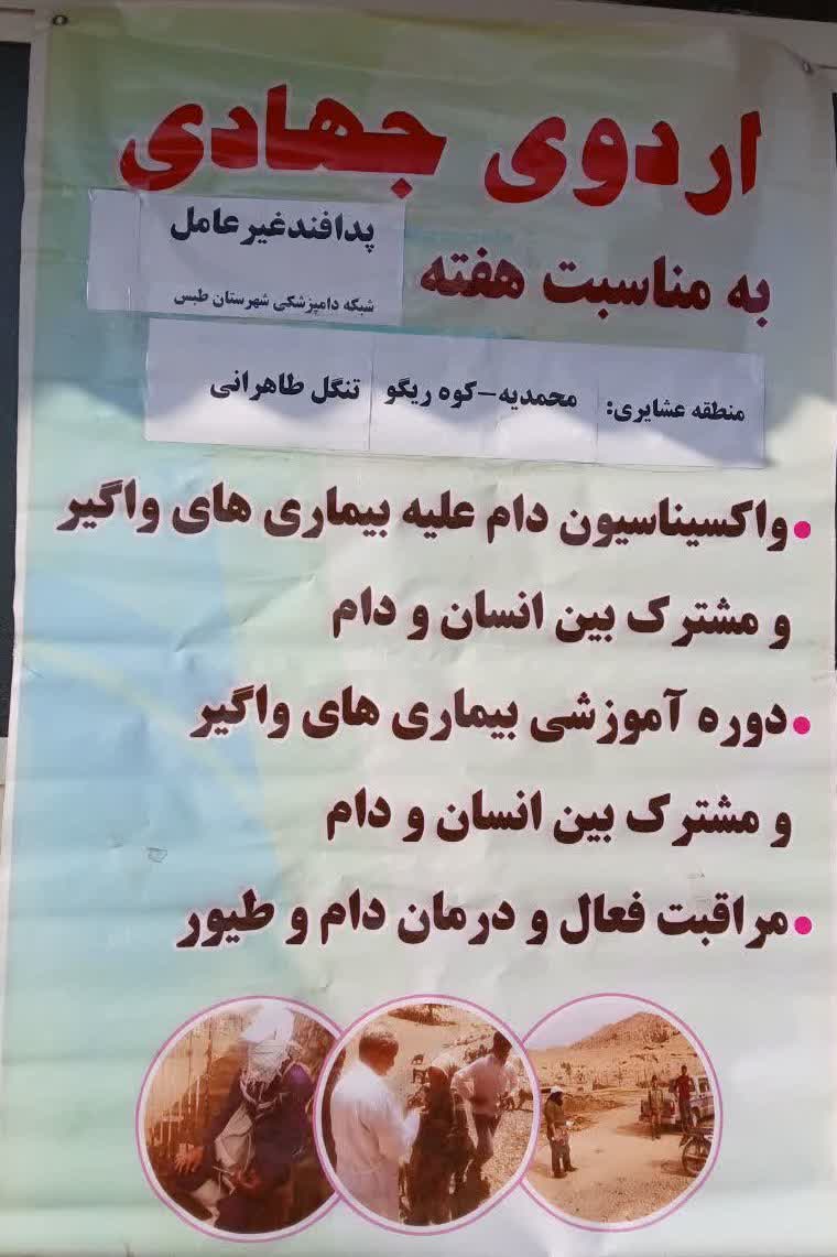 به گزارش روابط عمومی شبکه دامپزشکی شهرستان طبس، دکتر محمد جلال هادیان رئیس شبکه دامپزشکی اظهار نمود: در اجرای برنامه های کنترل، پیشگیری و مبارزه با بیماری های دامی و مشترک بین انسان و دام به ویژه بیماری تب برفکی و در راستای اجرای برنامه های جهادی شبکه دامپزشکی طبس این شبکه اقدام به برگزاری اردوی جهادی به مناسبت هفته پدافند غیر عامل در مناطق محروم و عشایری از جمله روستاهای محمدیه، تنگل طاهرانی، کوه ریگو، خراوان علیا و سفلی، شوراب کم نوری نمود.