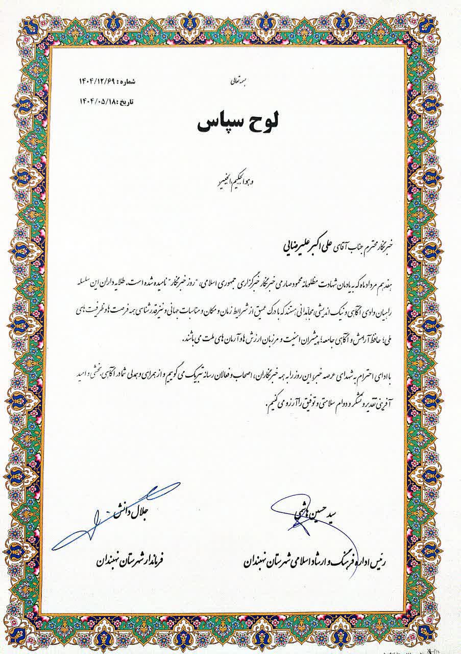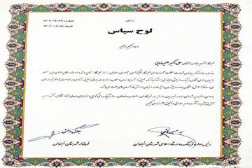متن لوح سپاس اهدایی فرماندار و رئیس اداره فرهنگ و ارشاد اسلامی به معاون شبکه دامپزشکی به شرح ذیل می باشد:
