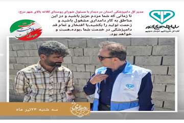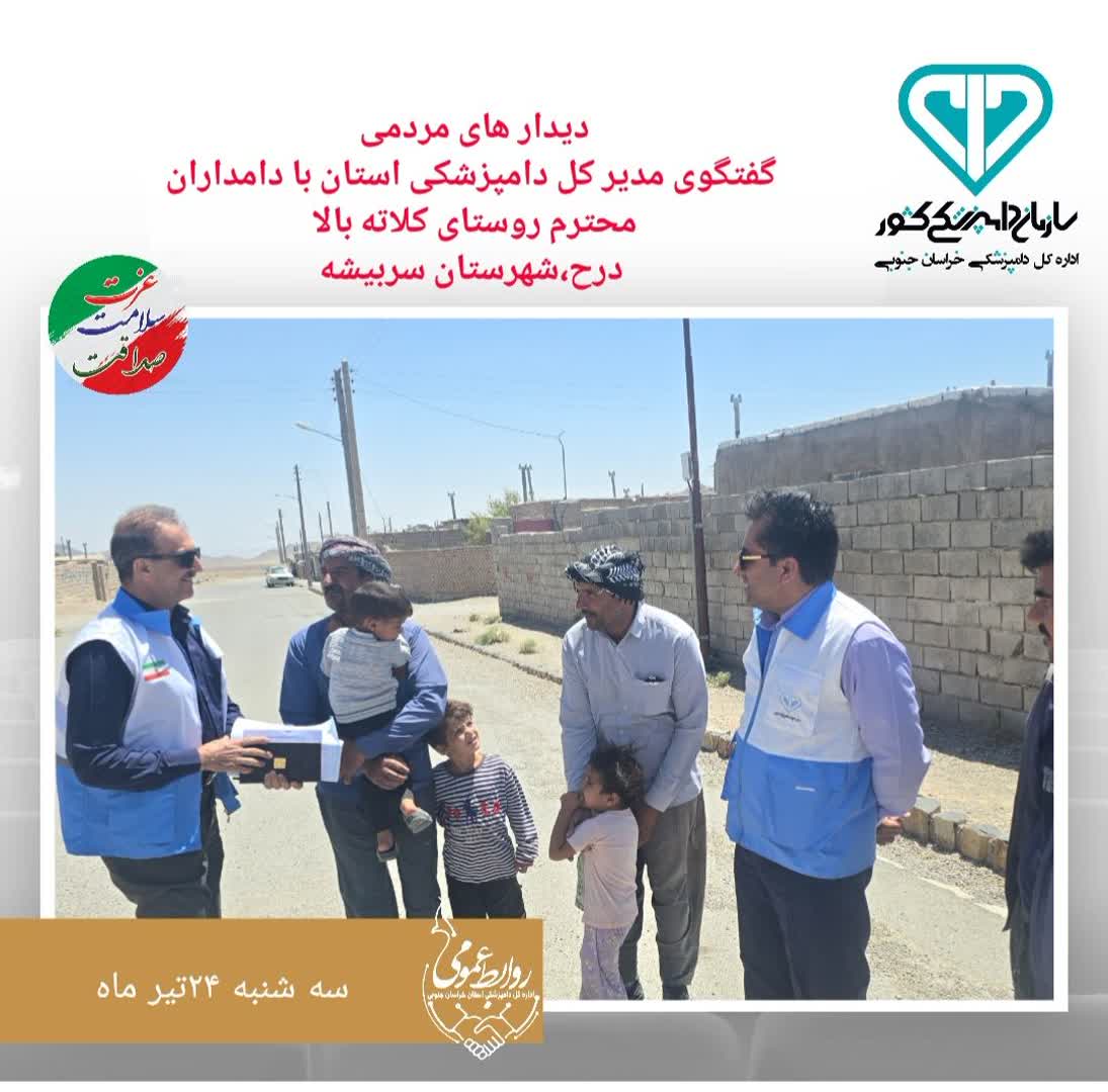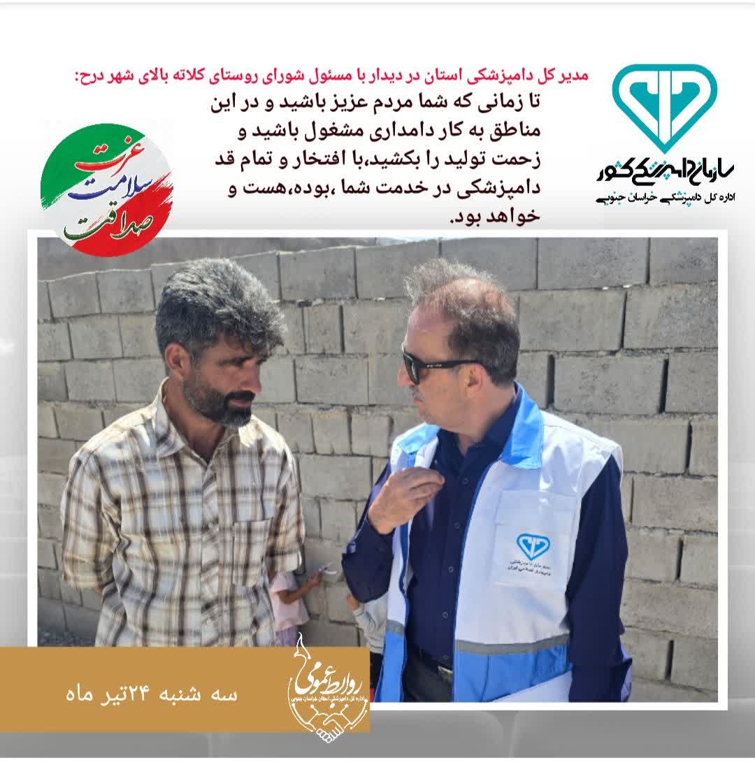 در این بازدید دکتر احمدی به روستای کلاته بالا از توابع شهر درح مراجعه نمود که دامداران رضایت خود را از عملکرد مثبت دامپزشکی اعلام نمودند.