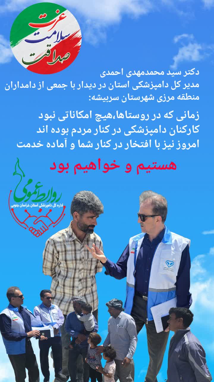 به گزارش روابط عمومی شبکه دامپزشکی شهرستان سربیشه، دکتر سید محمد مهدی احمدی مدیرکل دامپزشکی گفت: با توجه به مرزی بودن منطقه و محرومیت دامداران زحمتکش این خطه از کشور، باید به شکلی برنامه ریزی شود تا خدمات بهداشتی به بهترین شکل به دام و دامداران ارائه شود.