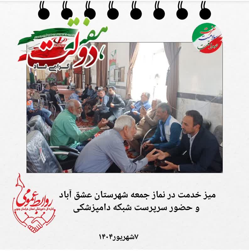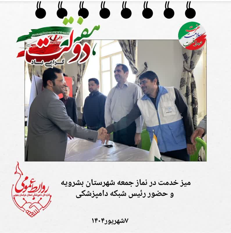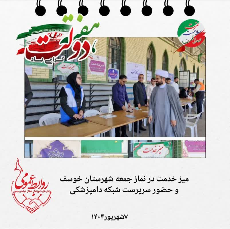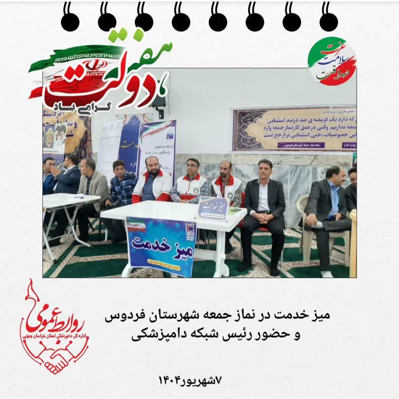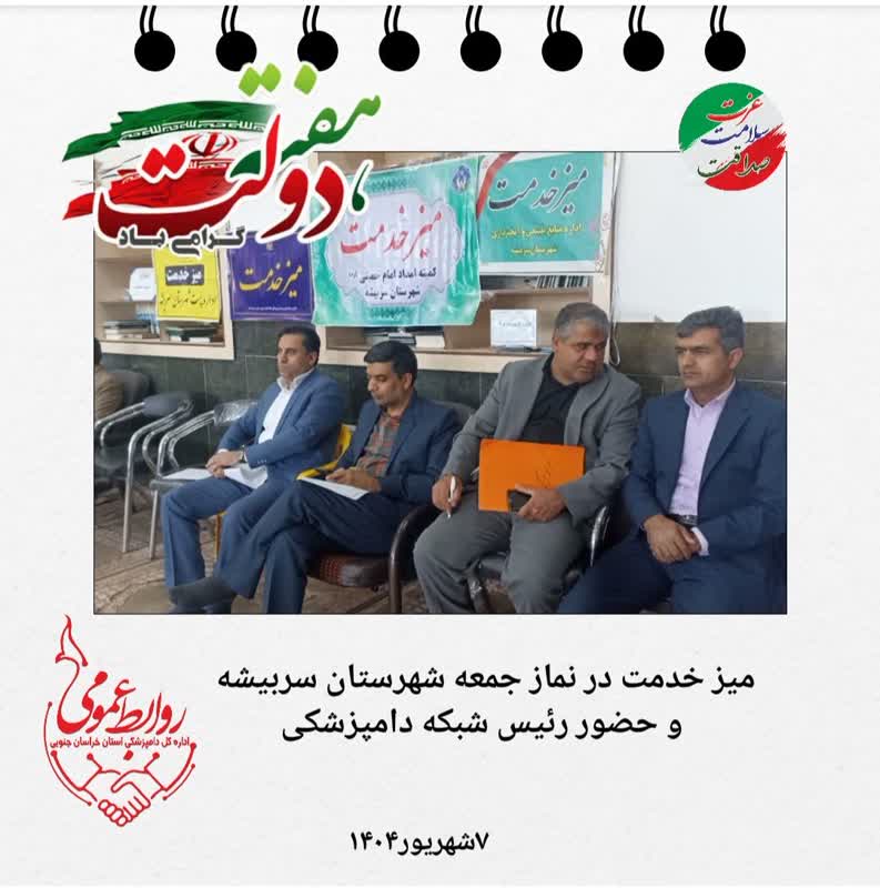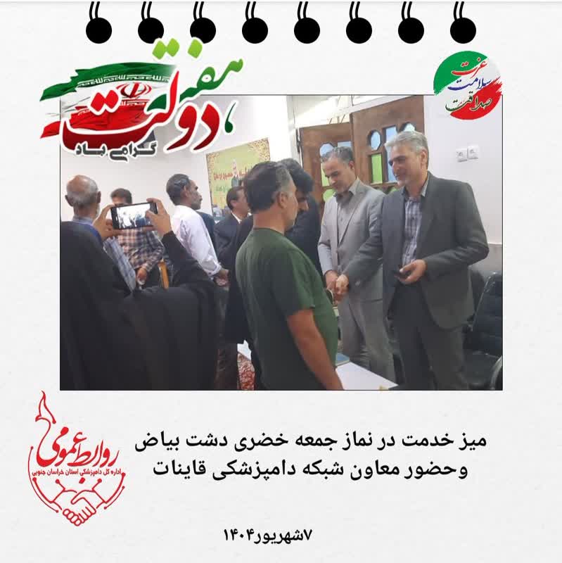به گزارش روابط عمومی اداره کل دامپزشکی استان خراسان جنوبی روز جمعه 7شهریور ماه میز خدمت در تمامی شهرستان های استان برپا شد و مسئولین استانی و شهرستانی با حضور در نماز جمعه به سوالات مراجعین محترم پاسخگو بودند.